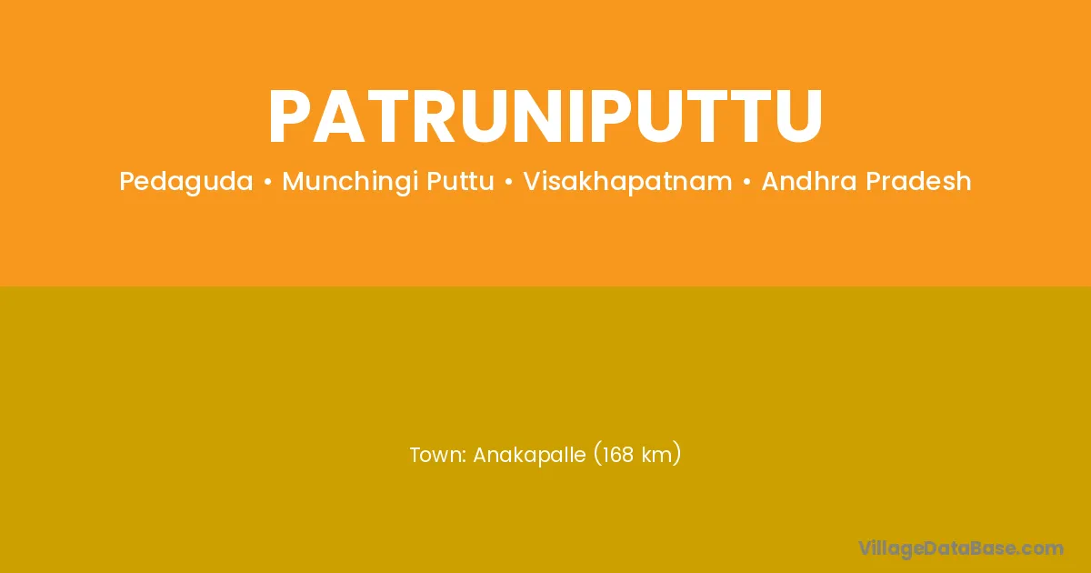 Anakapalle (168 km) is the nearest town to Patruniputtu village for major economic activities and is located approximately 168 km away.