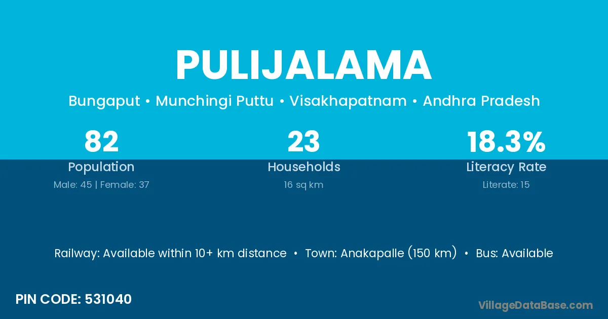 Anakapalle (150 km) is the nearest town to Pulijalama village for major economic activities and is located approximately 150 km away.