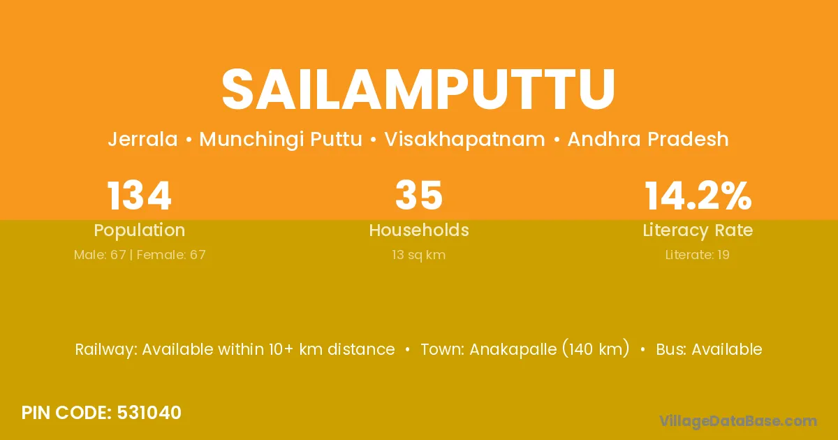 Anakapalle (140 km) is the nearest town to Sailamputtu village for major economic activities and is located approximately 140 km away.