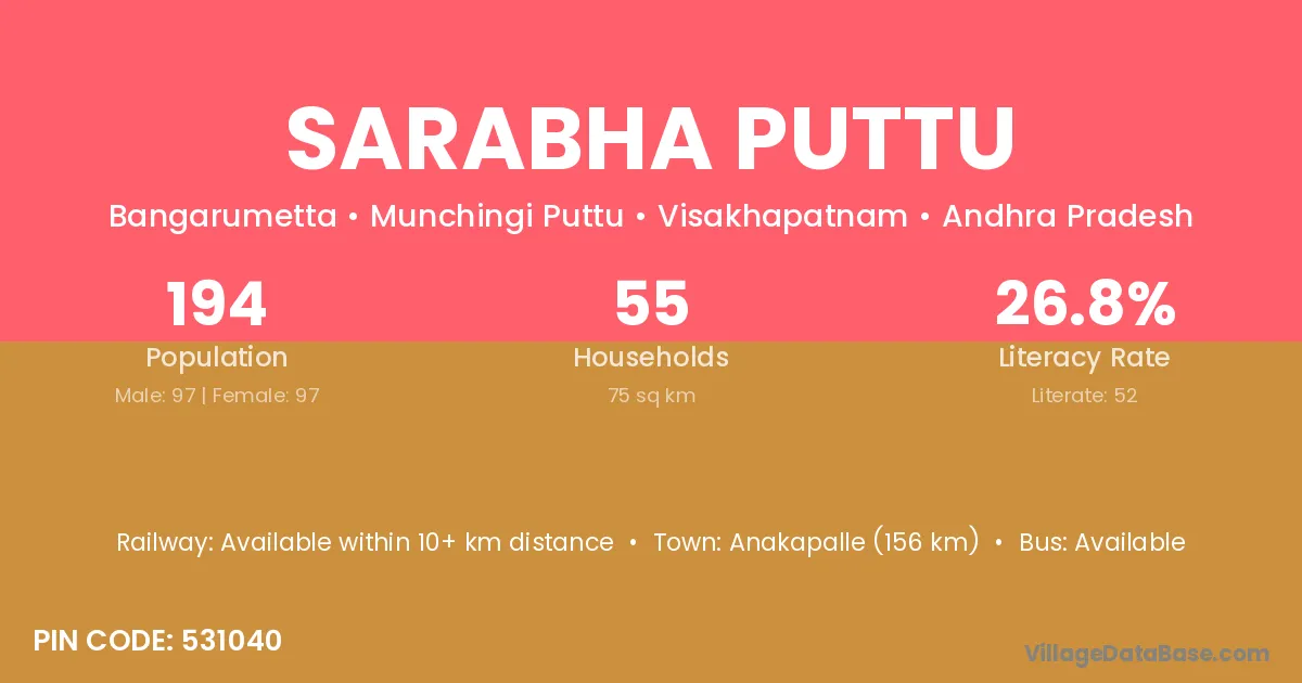 Sarabha Puttu village has a total population of 194 people, of which 97 are males and 97 are females.