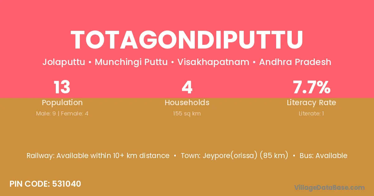 Jeypore(orissa) (85 km) is the nearest town to Totagondiputtu village for major economic activities and is located approximately 85 km away.