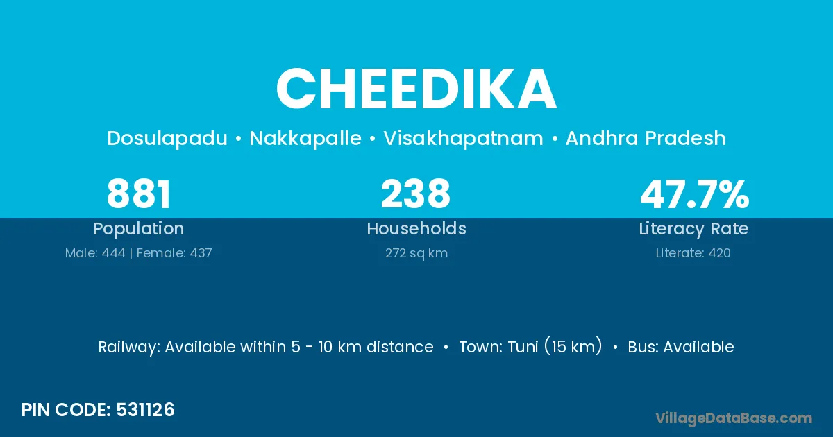 Cheedika village has a total population of 881 people, of which 444 are males and 437 are females.