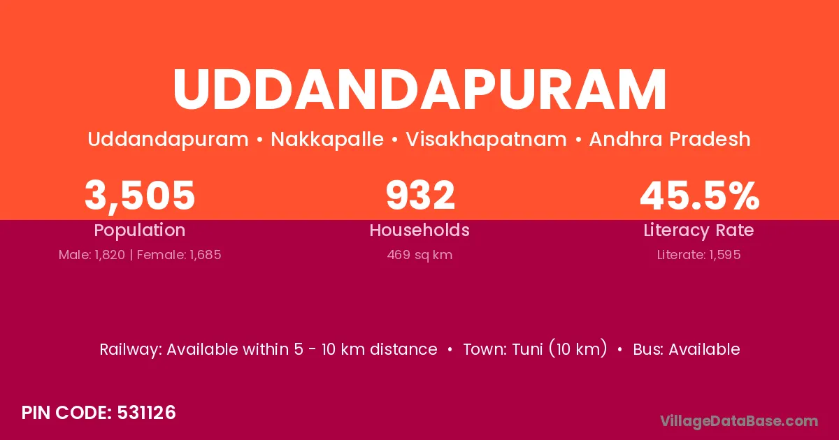 According to Census 2011 information, the village code of Uddandapuram village is 531126.