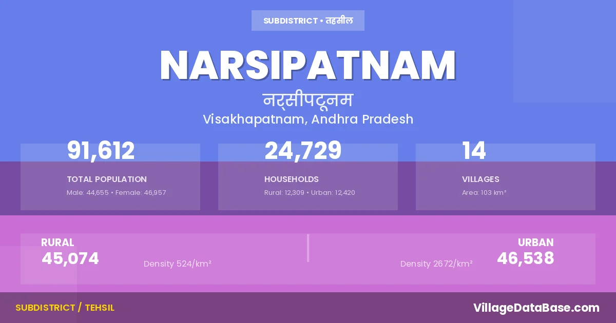 According to the 2011 census The total area of Narsipatnam Mandal is 103 km², with a population of 91612 people. The population density is 886 inhabitants per square kilometre, and there are approximately 24729 houses in the sub district.