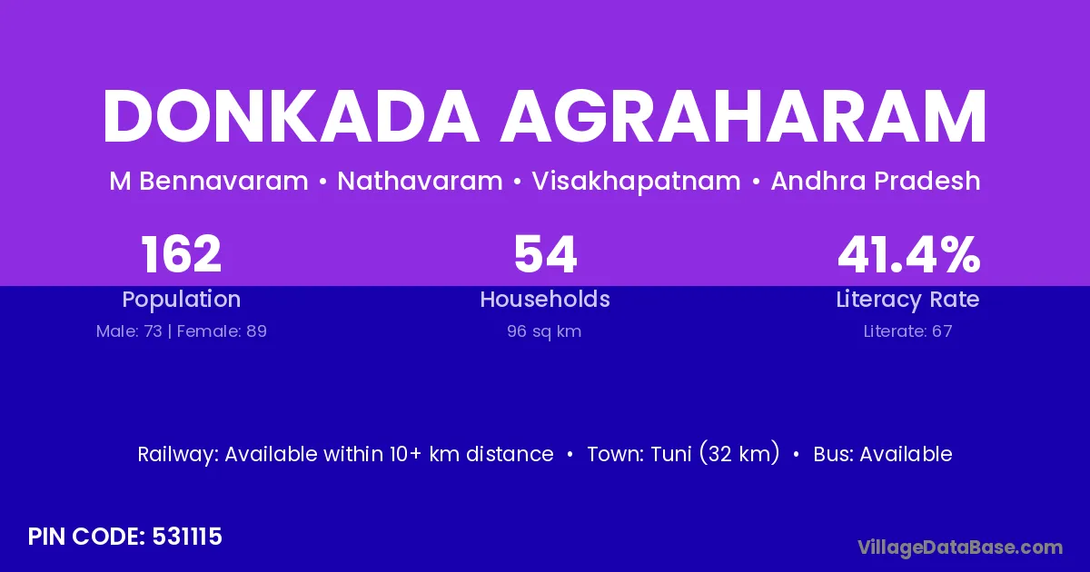 Tuni (32 km) is the nearest town to Donkada Agraharam village for major economic activities and is located approximately 32 km away.