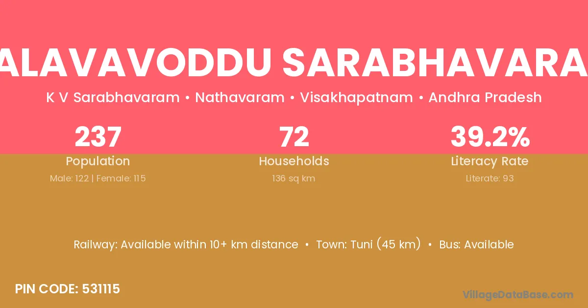 Kalavavoddu Sarabhavaram village has a total population of 237 people, of which 122 are males and 115 are females.