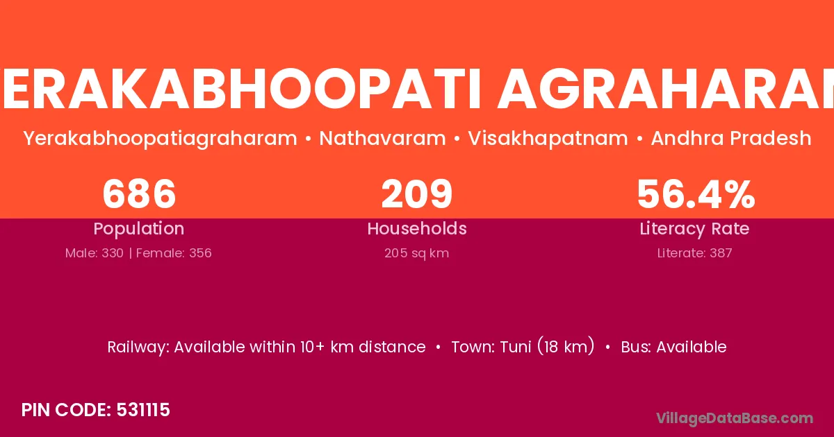 Yerakabhoopati Agraharam village has a total population of 686 people, of which 330 are males and 356 are females.