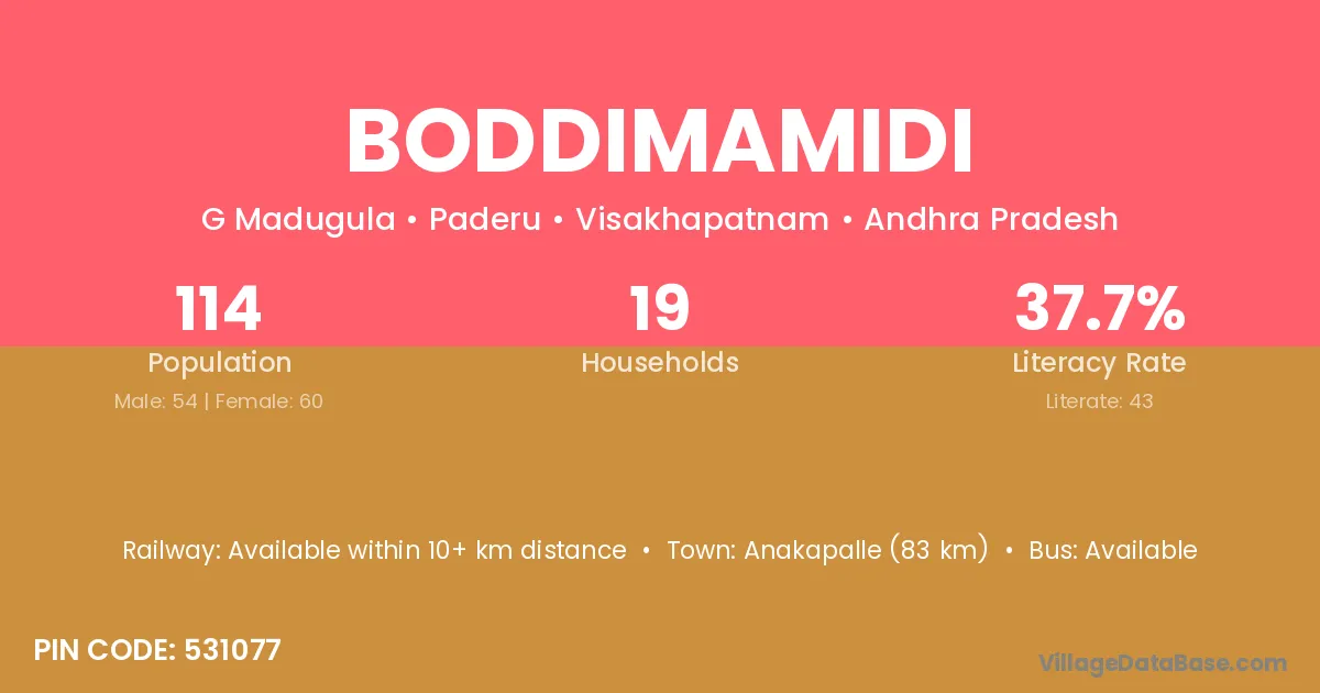 Anakapalle (83 km) is the nearest town to Boddimamidi village for major economic activities and is located approximately 83 km away.