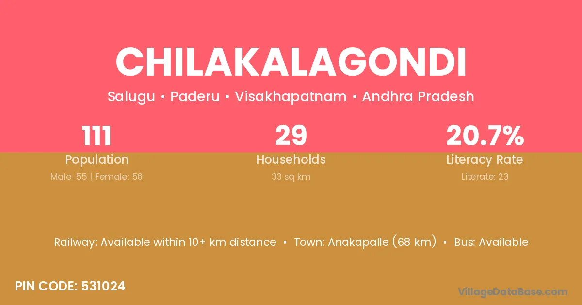 Chilakalagondi village has a total population of 111 people, of which 55 are males and 56 are females.