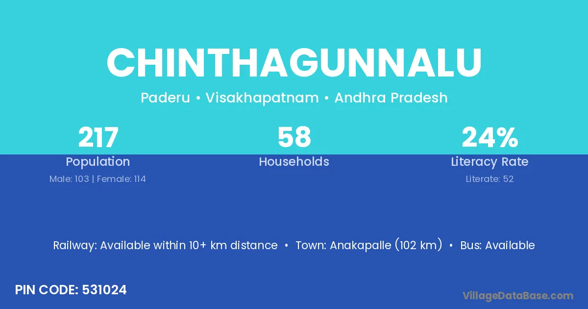 Chinthagunnalu village has a total population of 217 people, of which 103 are males and 114 are females.