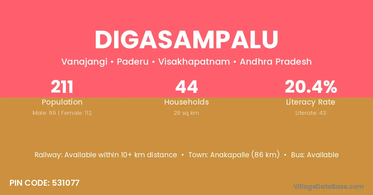 Digasampalu village has a total population of 211 people, of which 99 are males and 112 are females.