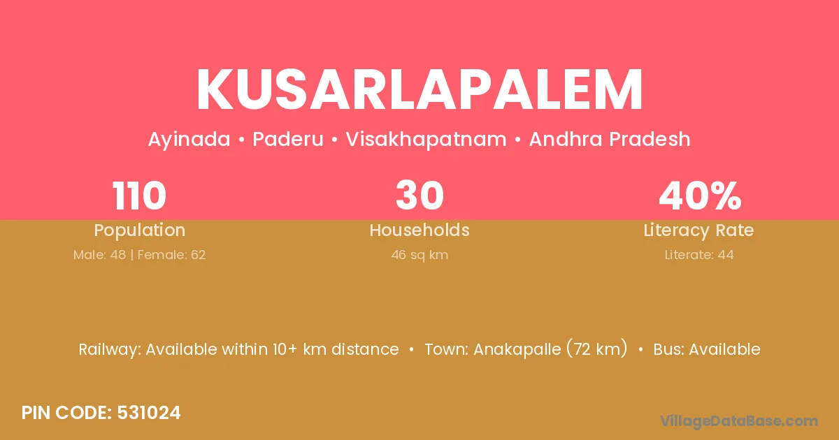 Kusarlapalem village has a total population of 110 people, of which 48 are males and 62 are females.