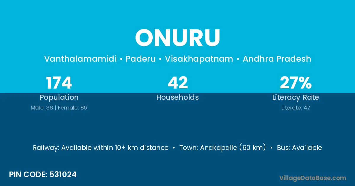 Anakapalle (60 km) is the nearest town to Onuru village for major economic activities and is located approximately 60 km away.