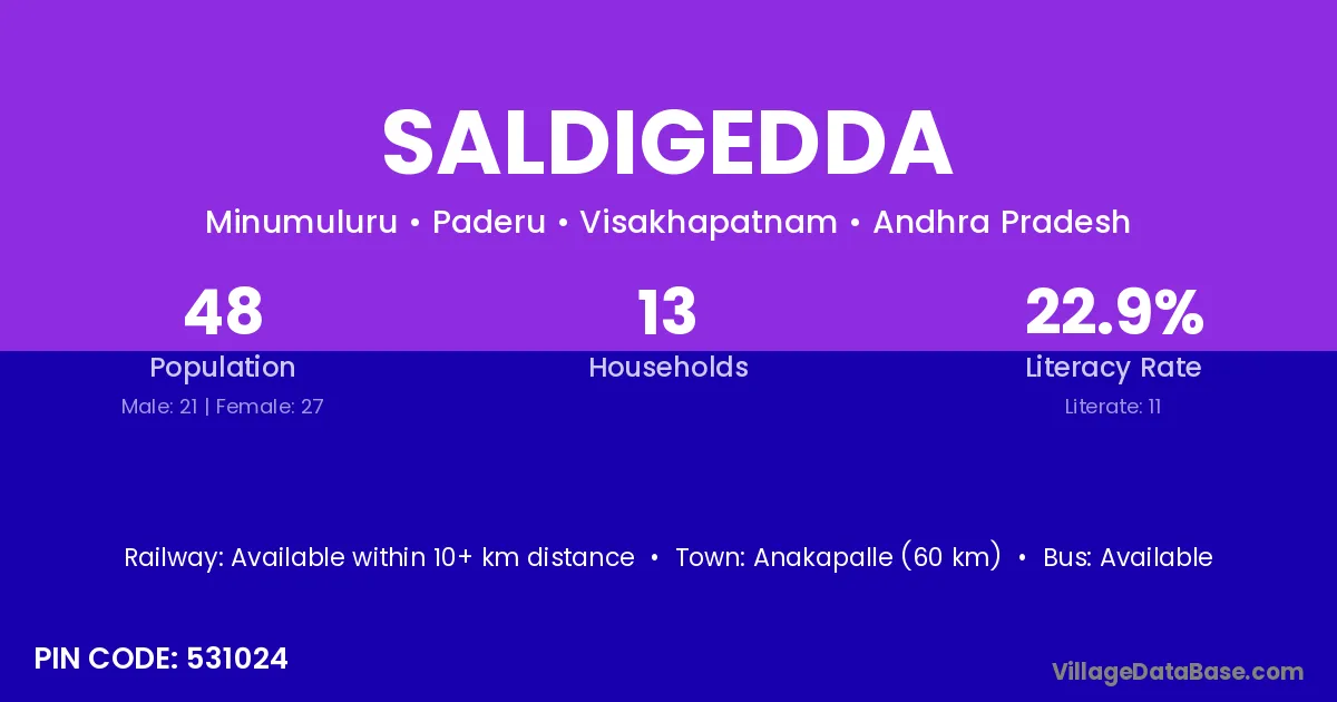 Anakapalle (60 km) is the nearest town to Saldigedda village for major economic activities and is located approximately 60 km away.