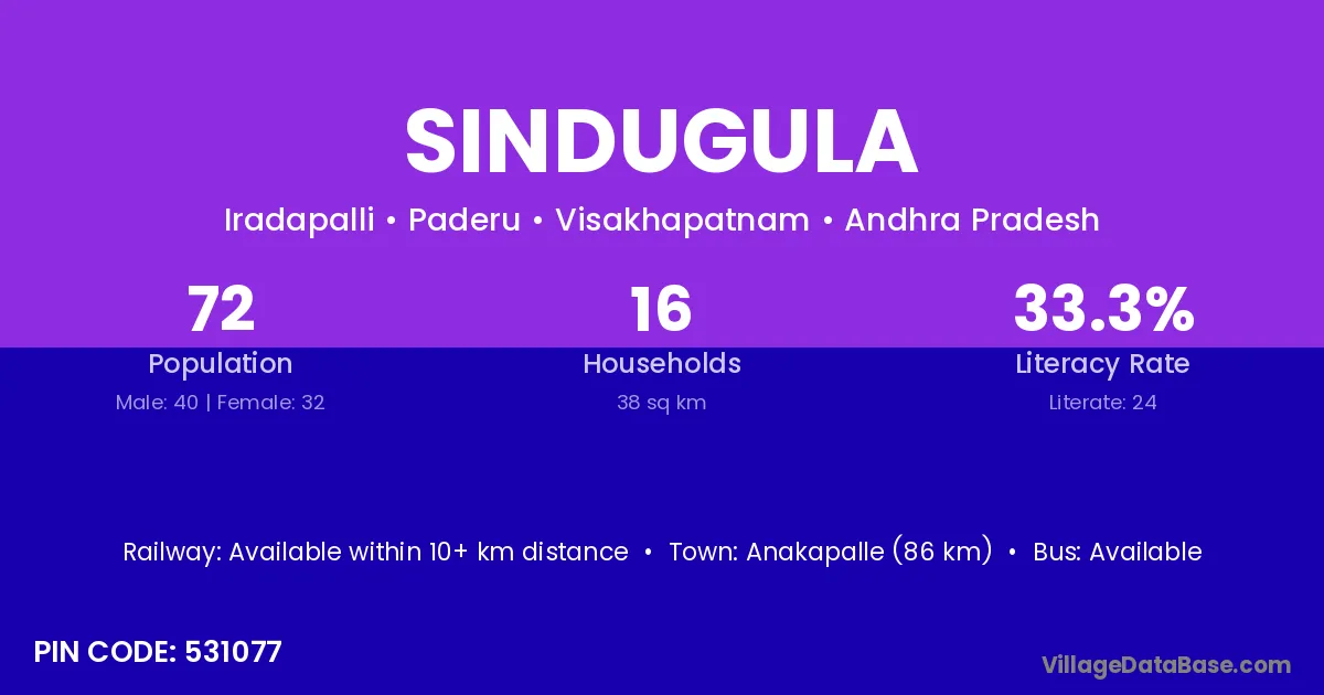 Anakapalle (86 km) is the nearest town to Sindugula village for major economic activities and is located approximately 86 km away.
