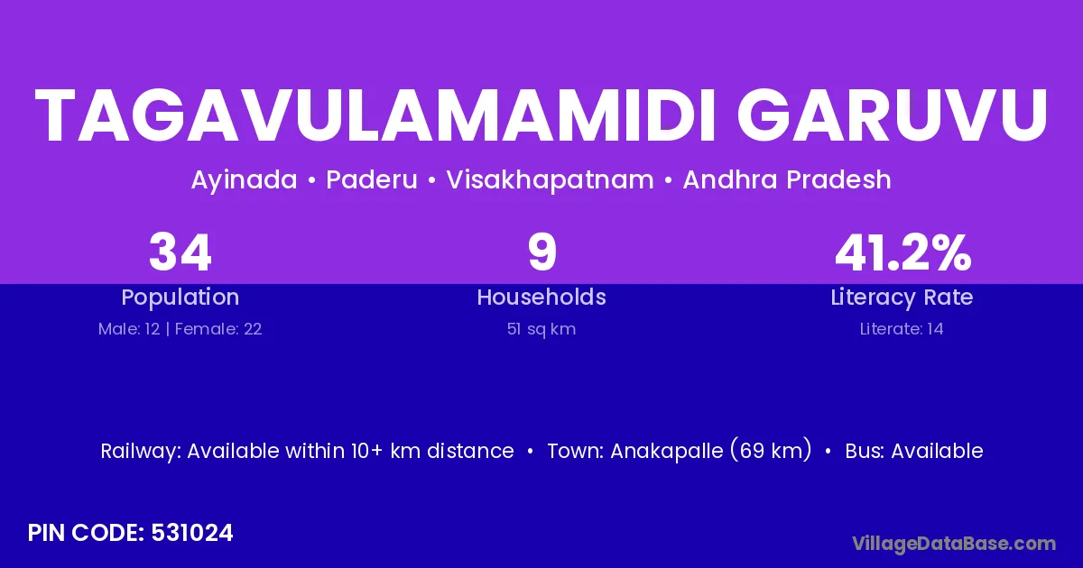 Tagavulamamidi Garuvu village has a total population of 34 people, of which 12 are males and 22 are females.