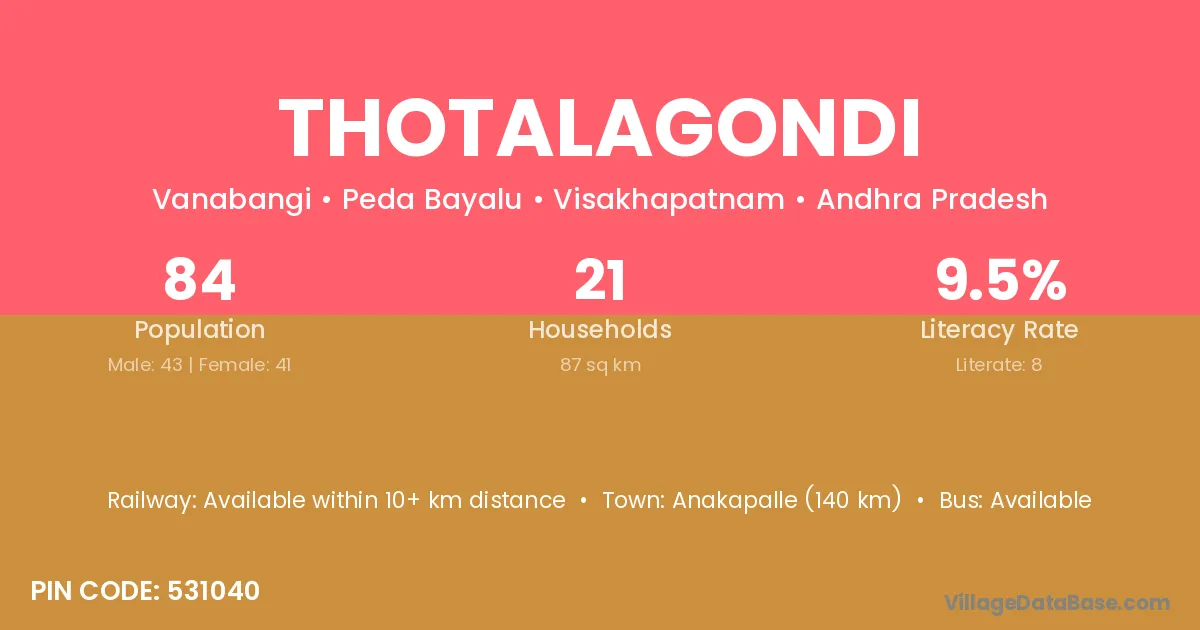 Anakapalle (95 km) is the nearest town to Thotalagondi village for major economic activities and is located approximately 95 km away.