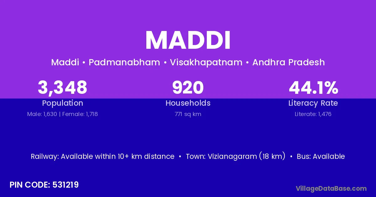 Vizianagaram (18 km) is the nearest town to Maddi village for major economic activities and is located approximately 18 km away.