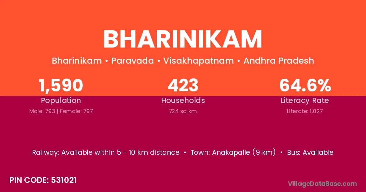 Anakapalle (9 km) is the nearest town to Bharinikam village for major economic activities and is located approximately 9 km away.