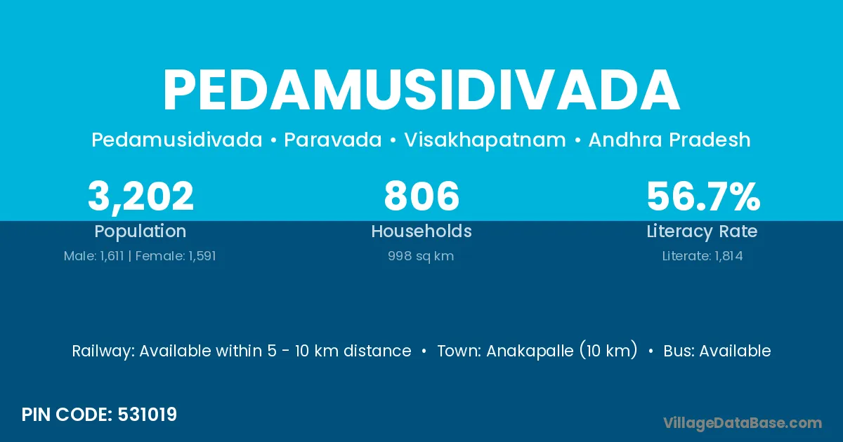 Pedamusidivada village has a total population of 3,202 people, of which 1,611 are males and 1,591 are females.