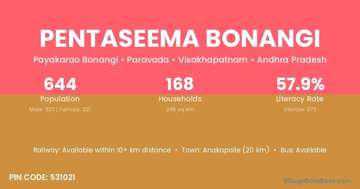 Pentaseema Bonangi village has a total population of 644 people, of which 323 are males and 321 are females.