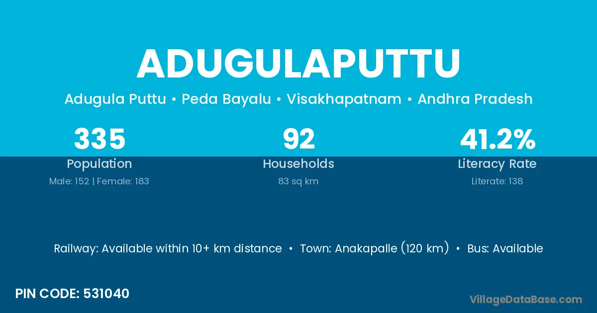 Adugulaputtu village has a total population of 335 people, of which 152 are males and 183 are females.