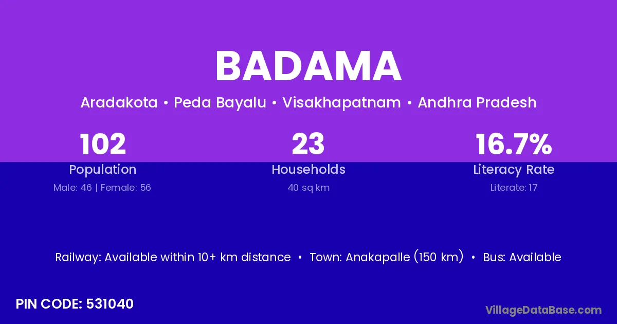 Anakapalle (150 km) is the nearest town to Badama village for major economic activities and is located approximately 150 km away.