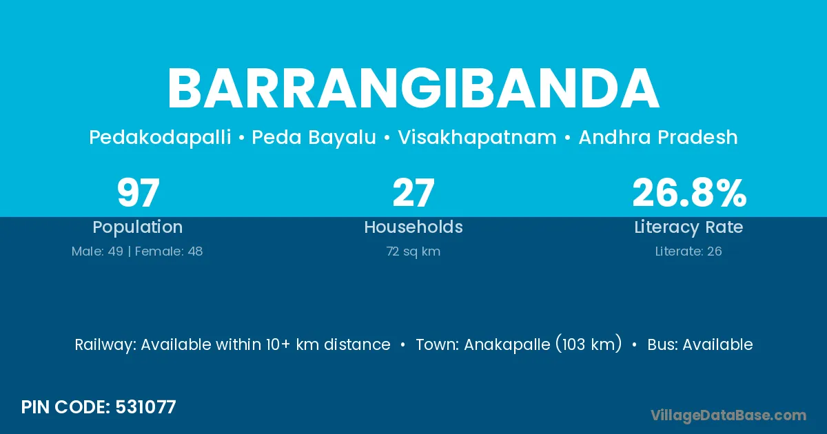 Anakapalle (103 km) is the nearest town to Barrangibanda village for major economic activities and is located approximately 103 km away.