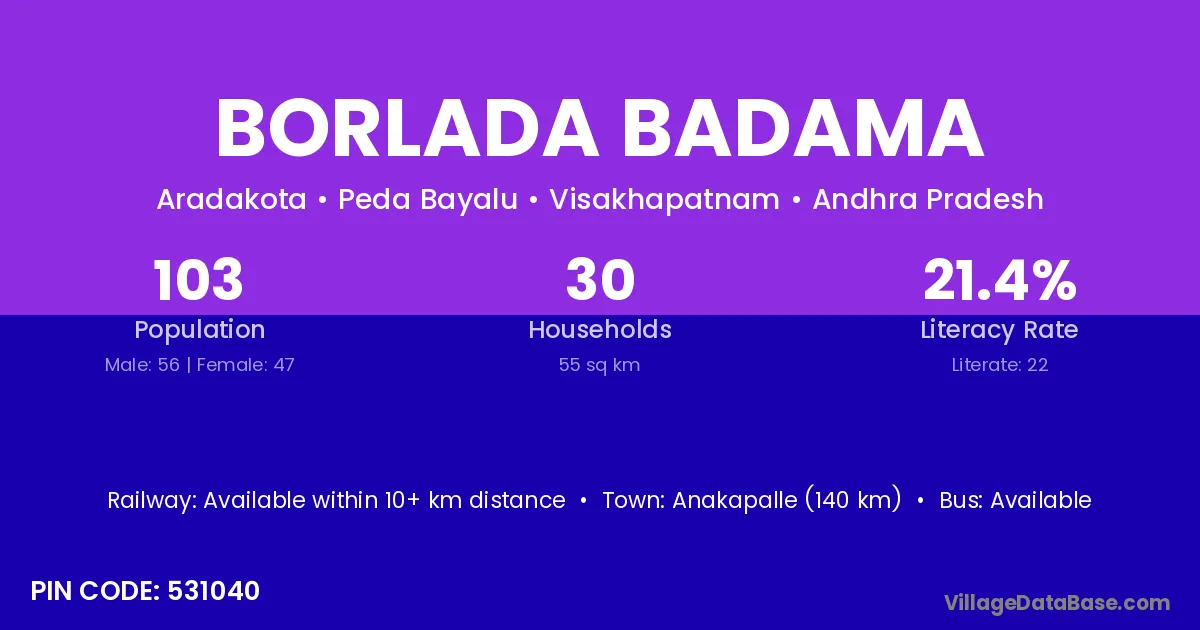 Anakapalle (140 km) is the nearest town to Borlada Badama village for major economic activities and is located approximately 140 km away.