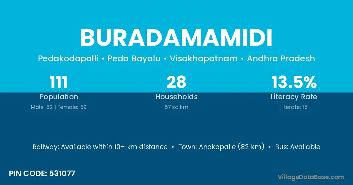 Anakapalle (82 km) is the nearest town to Buradamamidi village for major economic activities and is located approximately 82 km away.