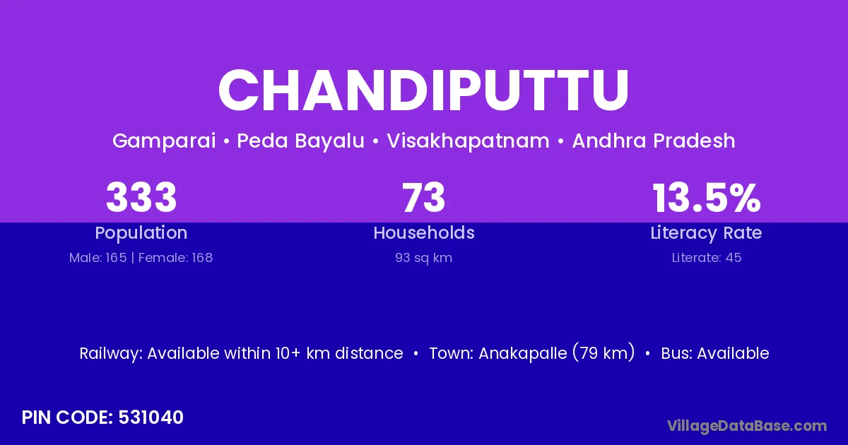 Anakapalle (79 km) is the nearest town to Chandiputtu village for major economic activities and is located approximately 79 km away.