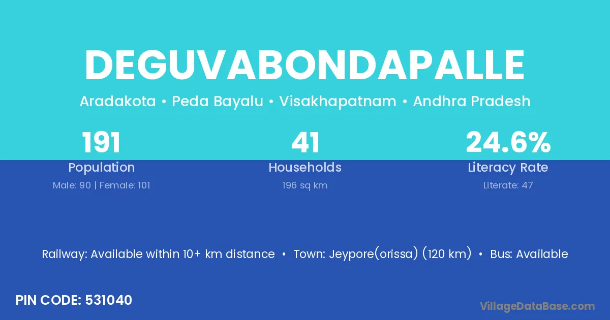 Jeypore(orissa) (120 km) is the nearest town to Deguvabondapalle village for major economic activities and is located approximately 120 km away.