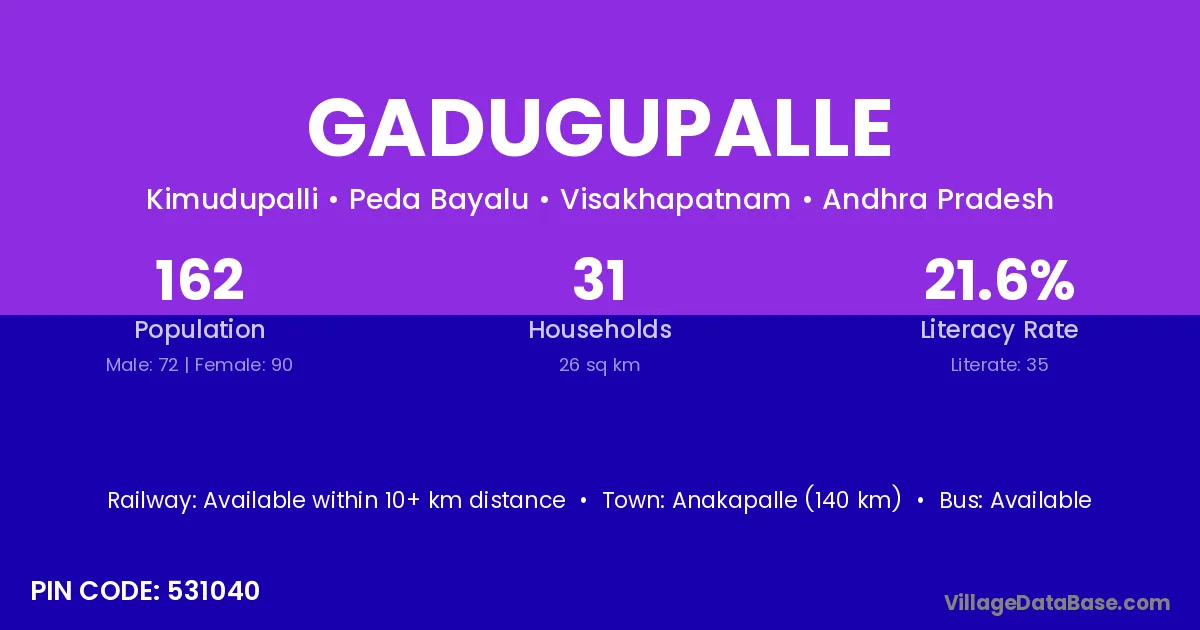 Gadugupalle village has a total population of 162 people, of which 72 are males and 90 are females.