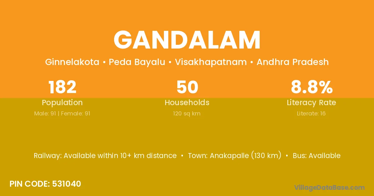 Anakapalle (130 km) is the nearest town to Gandalam village for major economic activities and is located approximately 130 km away.