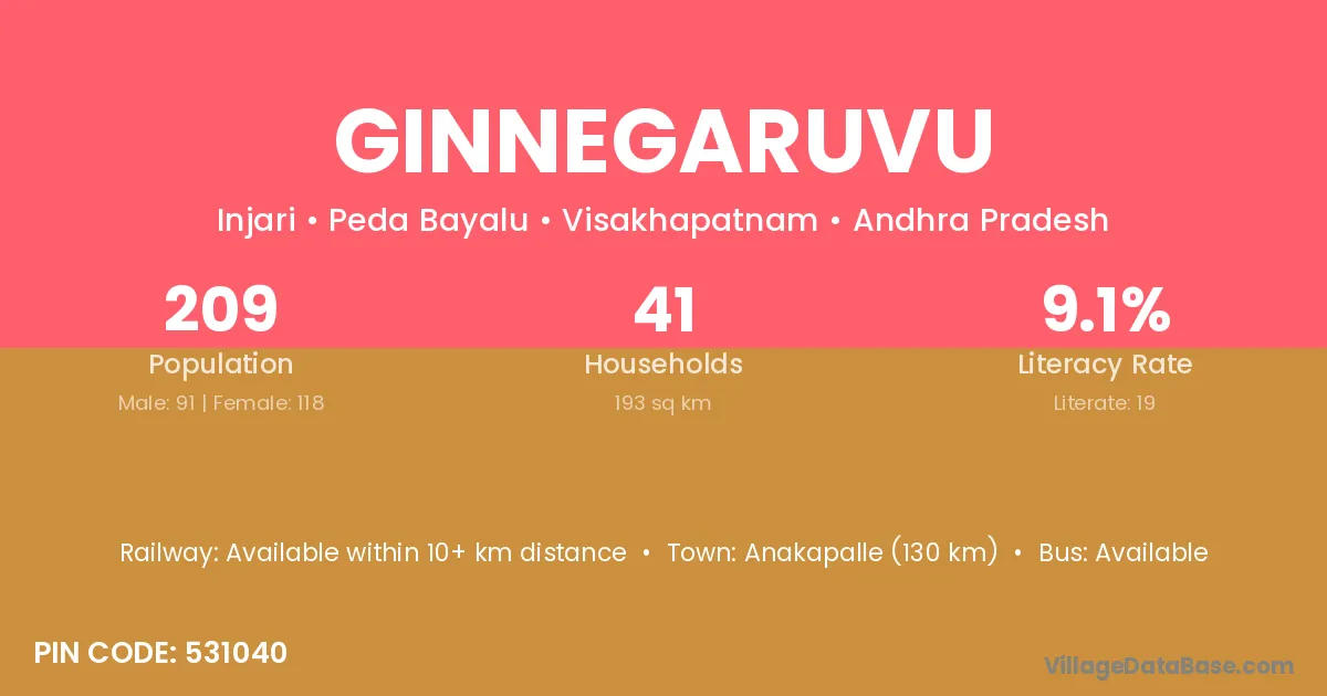 Ginnegaruvu village has a total population of 209 people, of which 91 are males and 118 are females.