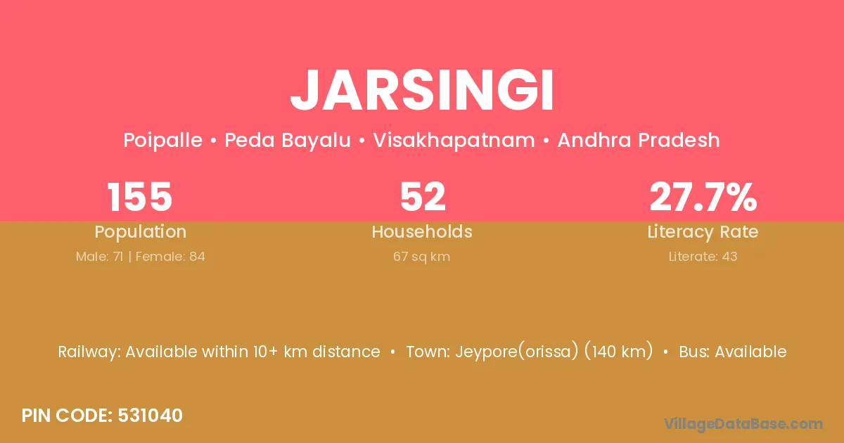 Jeypore(orissa) (140 km) is the nearest town to Jarsingi village for major economic activities and is located approximately 140 km away.