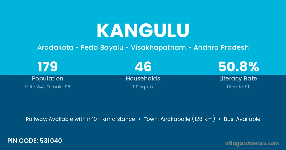 Anakapalle (128 km) is the nearest town to Kangulu village for major economic activities and is located approximately 128 km away.