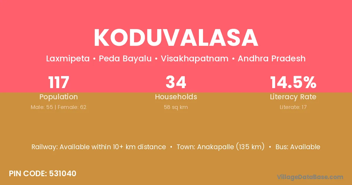 Koduvalasa village has a total population of 117 people, of which 55 are males and 62 are females.
