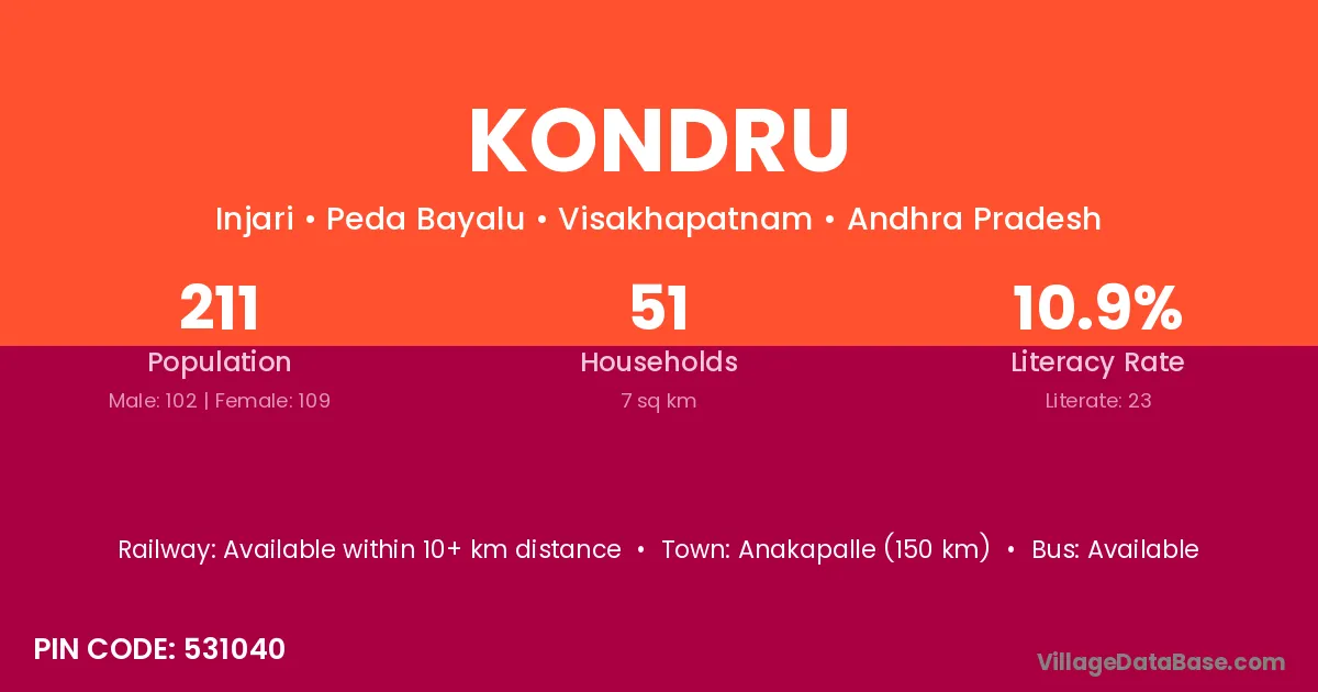 Anakapalle (150 km) is the nearest town to Kondru village for major economic activities and is located approximately 150 km away.