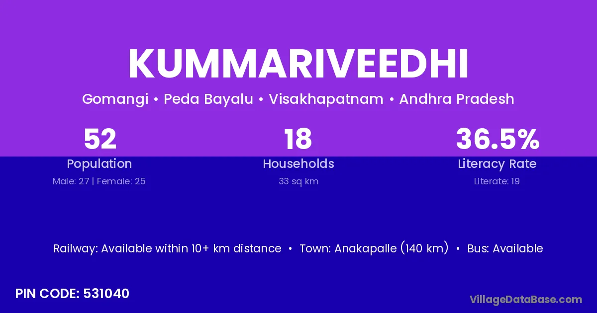Kummariveedhi village has a total population of 52 people, of which 27 are males and 25 are females.