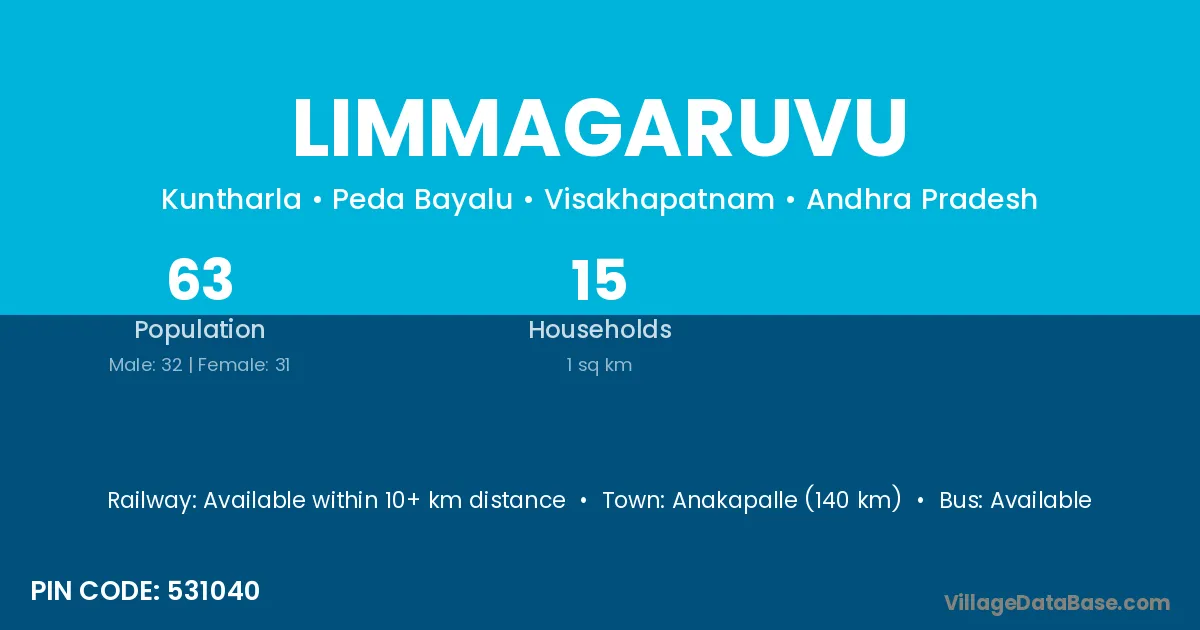 Limmagaruvu village has a total population of 63 people, of which 32 are males and 31 are females.