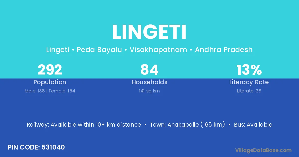 Anakapalle (165 km) is the nearest town to Lingeti village for major economic activities and is located approximately 165 km away.