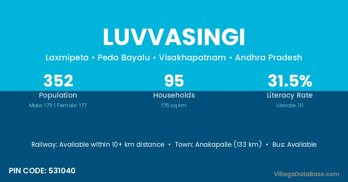 Anakapalle (133 km) is the nearest town to Luvvasingi village for major economic activities and is located approximately 133 km away.