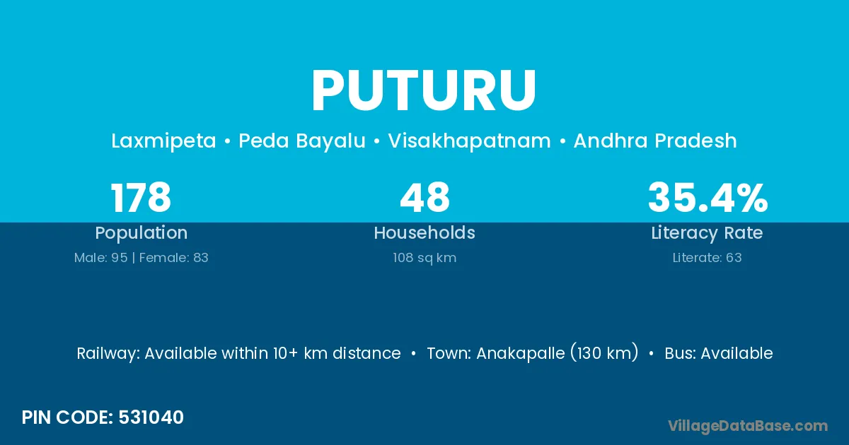 Anakapalle (130 km) is the nearest town to Puturu village for major economic activities and is located approximately 130 km away.
