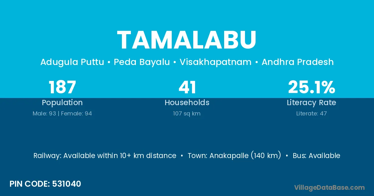 Anakapalle (140 km) is the nearest town to Tamalabu village for major economic activities and is located approximately 140 km away.
