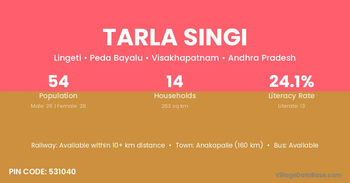 Anakapalle (160 km) is the nearest town to Tarla Singi village for major economic activities and is located approximately 160 km away.