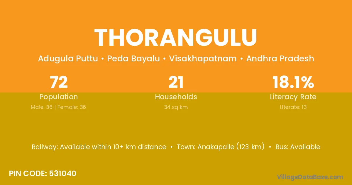 Thorangulu village has a total population of 72 people, of which 36 are males and 36 are females.