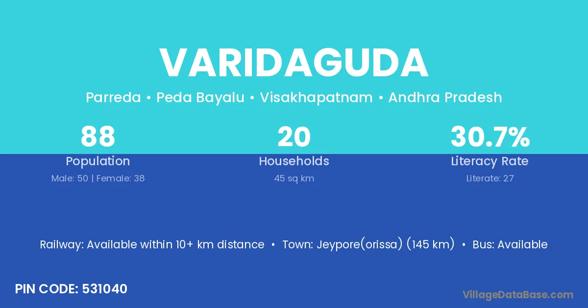 Varidaguda village has a total population of 88 people, of which 50 are males and 38 are females.
