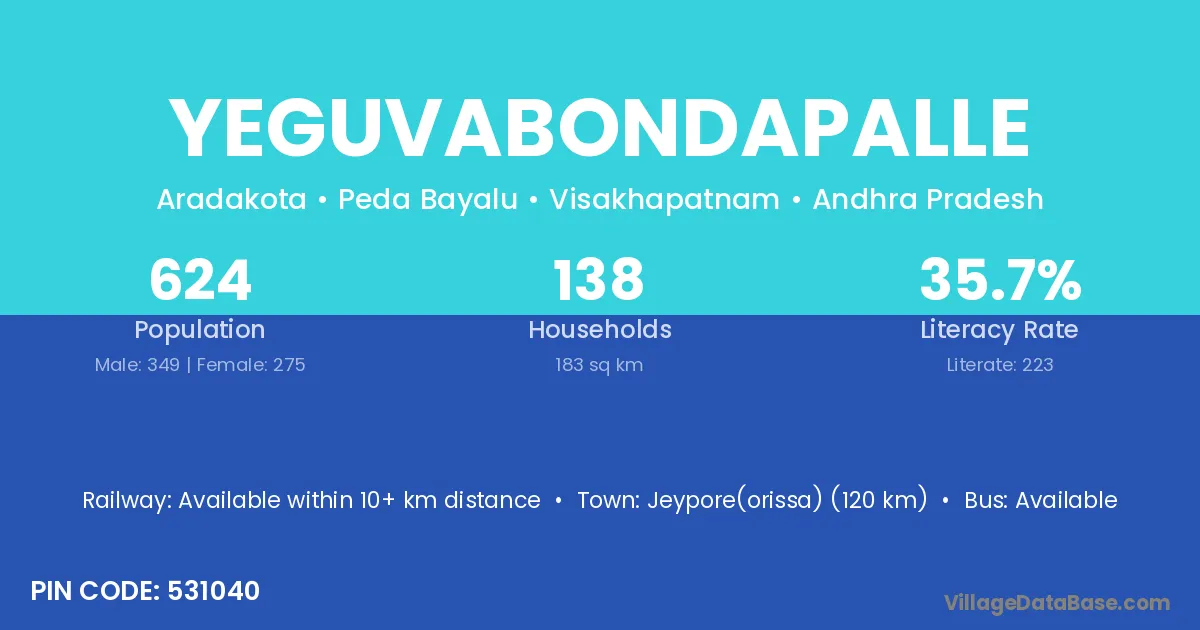 Jeypore(orissa) (120 km) is the nearest town to Yeguvabondapalle village for major economic activities and is located approximately 120 km away.
