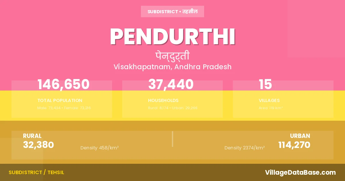 According to the 2011 census The total area of Pendurthi Mandal is 119 km², with a population of 146650 people. The population density is 1,234 inhabitants per square kilometre, and there are approximately 37440 houses in the sub district.